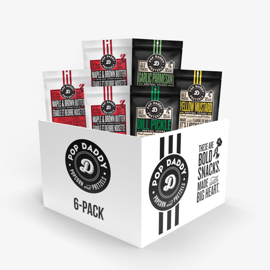 This bundle includes (3) 7.5 oz bags of Maple & Brown Butter Pretzels, 1 Garlic Parmesan, 1 Dill Pickle, 1 Yellow Mustard.